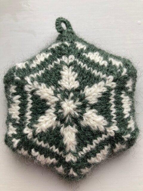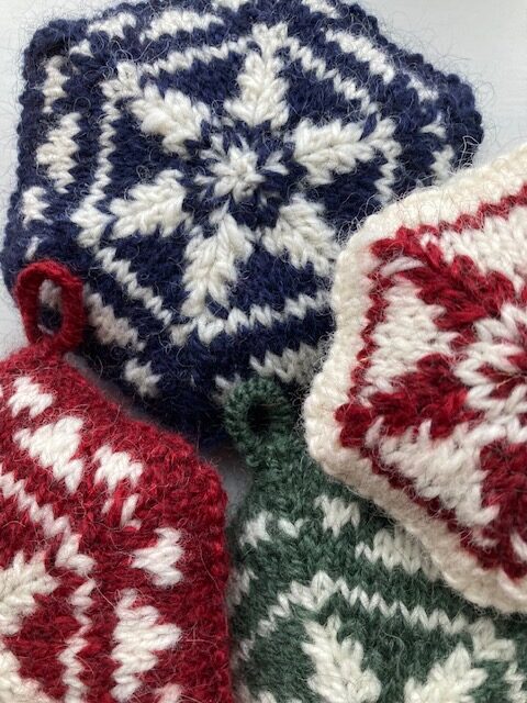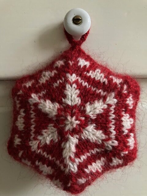 Lille julet ophæng strikket i Håndværksgarn fra Hjelholts Uldspinderi.