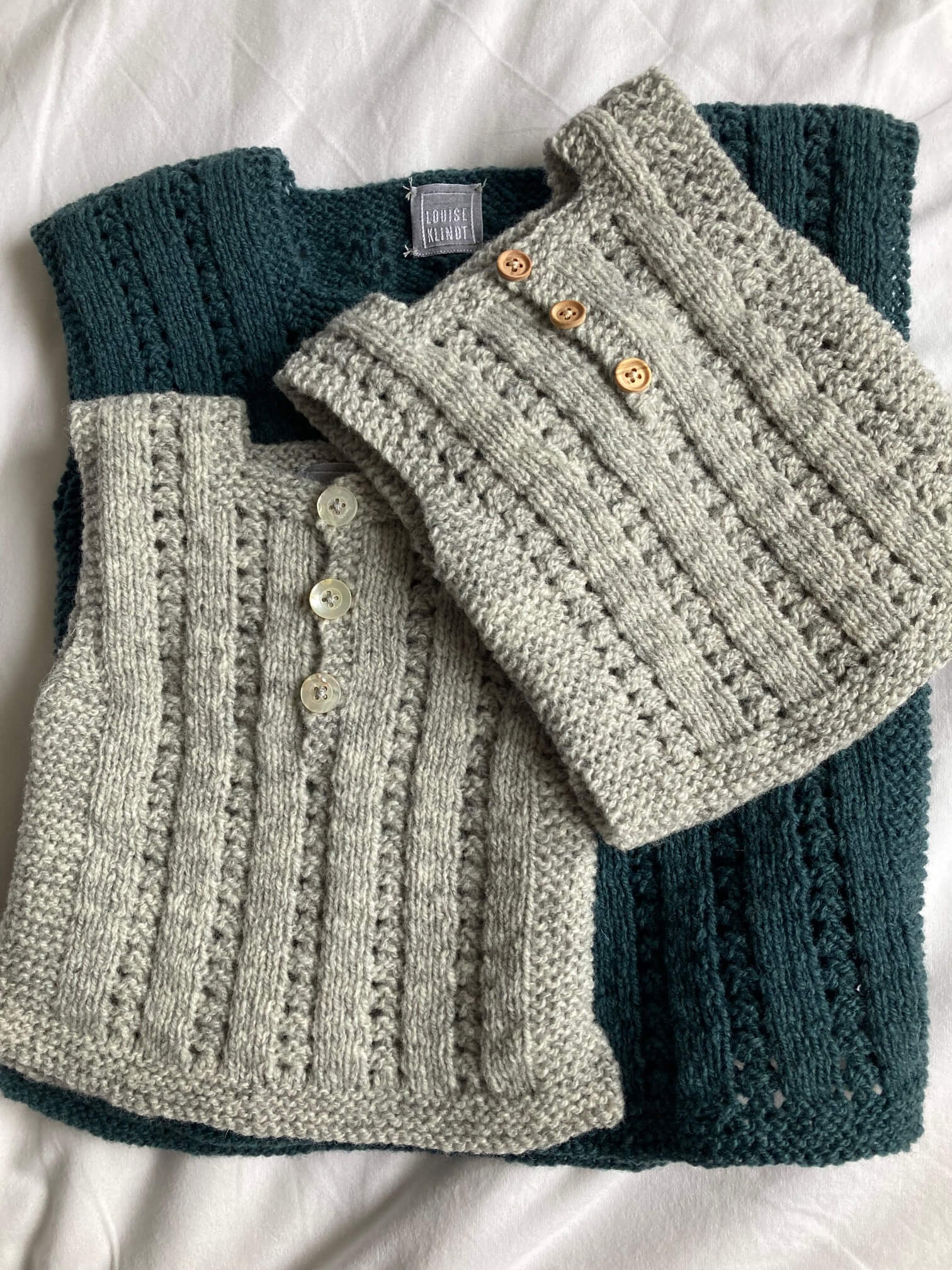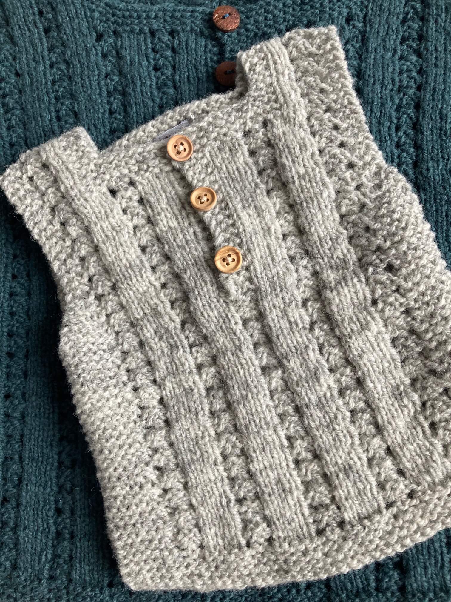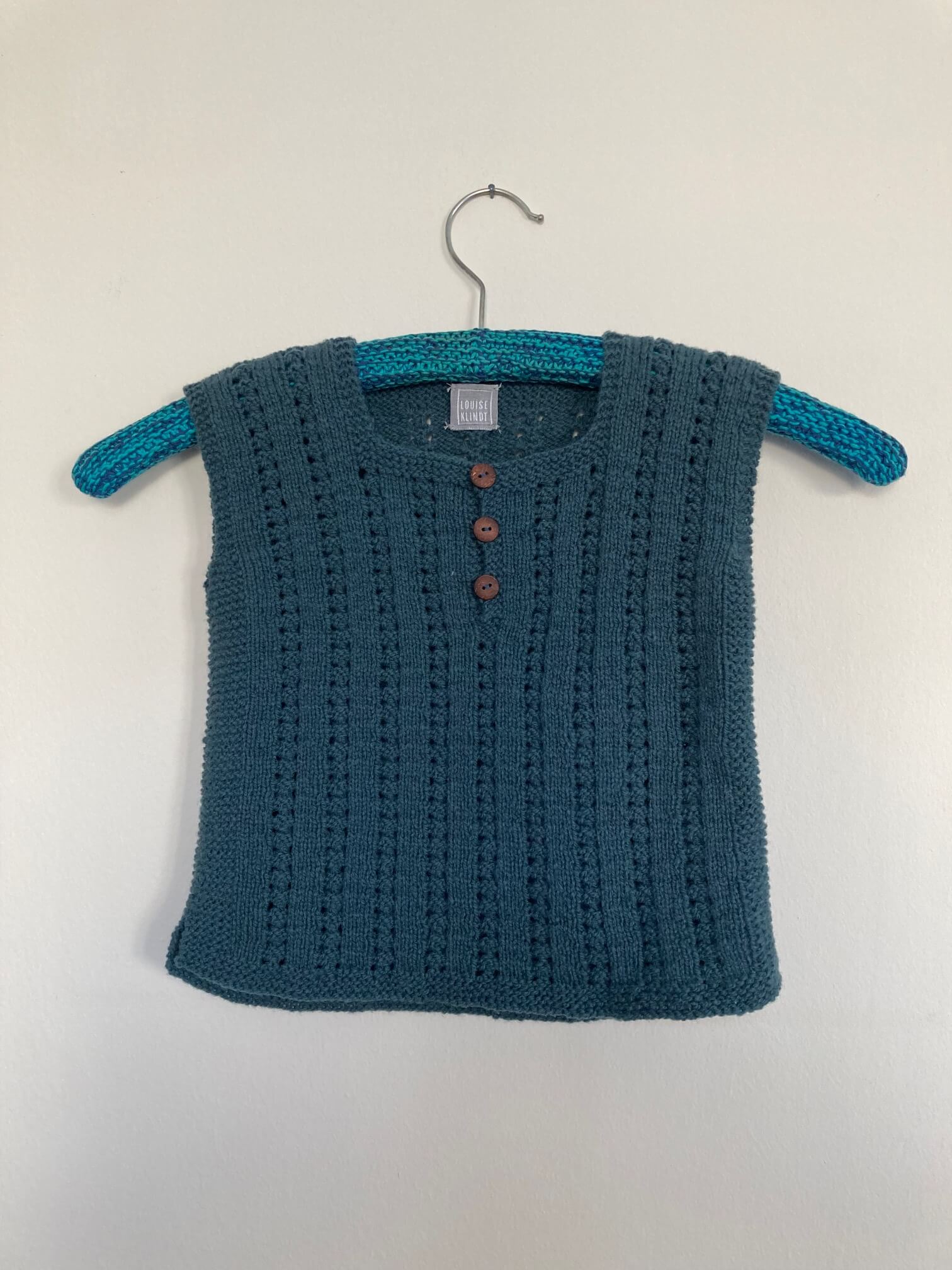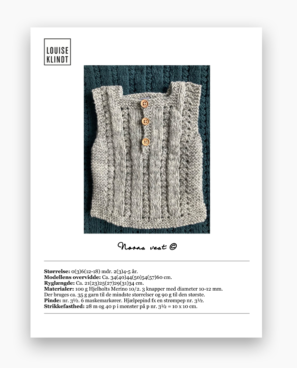 Noras vest kan strikkes i syv forskellige størrelser – fra nyfødt til størrelse fem år. Den kan bruges, fra den er lidt for stor, til den bliver lidt for lille og sidder som en “cropped top”. Jeg har strikket den i Hjelholts Merino 10/2, som er et dejligt blødt uldgarn. Og der går kun 35 gram til den mindste og omkring 90 gram til størrelse 5 år.